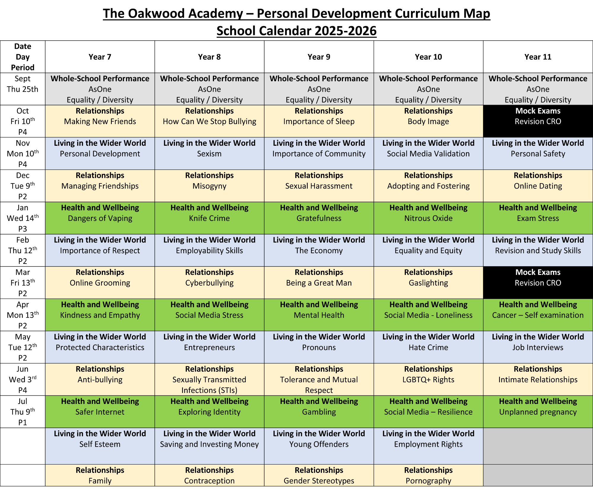 All students take part in RSHE lessons for one hour every three weeks, known as the Personal Development Period (PDP). These are age-related sessions that allow specific content to be delivered effectively.